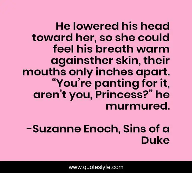 This page presents the quote "He lowered his head toward her, so she could feel his breath warm againsther skin, their mouths only inches apart. “You’re panting for it, aren’t you, Princess?” he murmured.". Author of this quote is Suzanne Enoch, Sins of a Duke. .