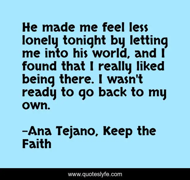 This page presents the quote "He made me feel less lonely tonight by letting me into his world, and I found that I really liked being there. I wasn't ready to go back to my own.". Author of this quote is Ana Tejano, Keep the Faith. This quote is about heartbreak, love, moving-on, affection,.