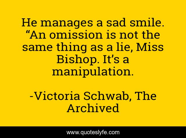 This page presents the quote "He manages a sad smile. “An omission is not the same thing as a lie, Miss Bishop. It’s a manipulation.". Author of this quote is Victoria Schwab, The Archived. This quote is about lies, omissions, manipulation,.