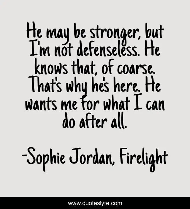 This page presents the quote "He may be stronger, but I'm not defenseless. He knows that, of coarse. That's why he's here. He wants me for what I can do after all.". Author of this quote is Sophie Jordan, Firelight. This quote is about draki, urban-fantasy, paranormal, fiction, romance, fantasy, shapeshifters, young-adult,.