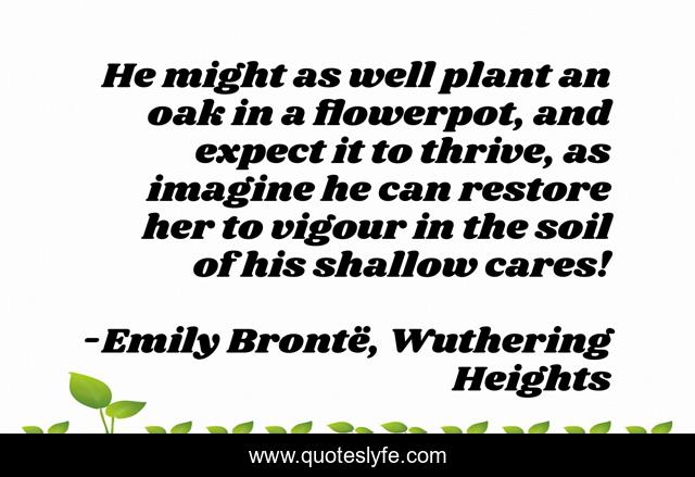 This page presents the quote "He might as well plant an oak in a flowerpot, and expect it to thrive, as imagine he can restore her to vigour in the soil of his shallow cares!". Author of this quote is Emily Brontë, Wuthering Heights. This quote is about wuthering-heights, spirit, containment,.