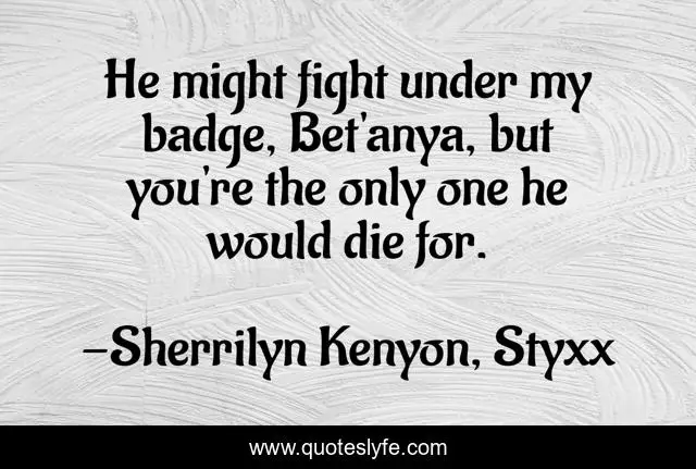 This page presents the quote "He might fight under my badge, Bet'anya, but you're the only one he would die for.". Author of this quote is Sherrilyn Kenyon, Styxx. This quote is about love, justice, bethany, truth, affection, athena,.