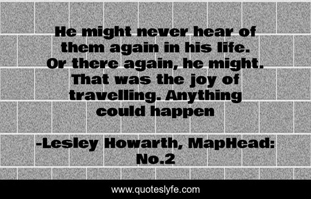 This page presents the quote "He might never hear of them again in his life. Or there again, he might. That was the joy of travelling. Anything could happen". Author of this quote is Lesley Howarth, MapHead: No.2. This quote is about lesley-howarth, travel, maphead-2,.