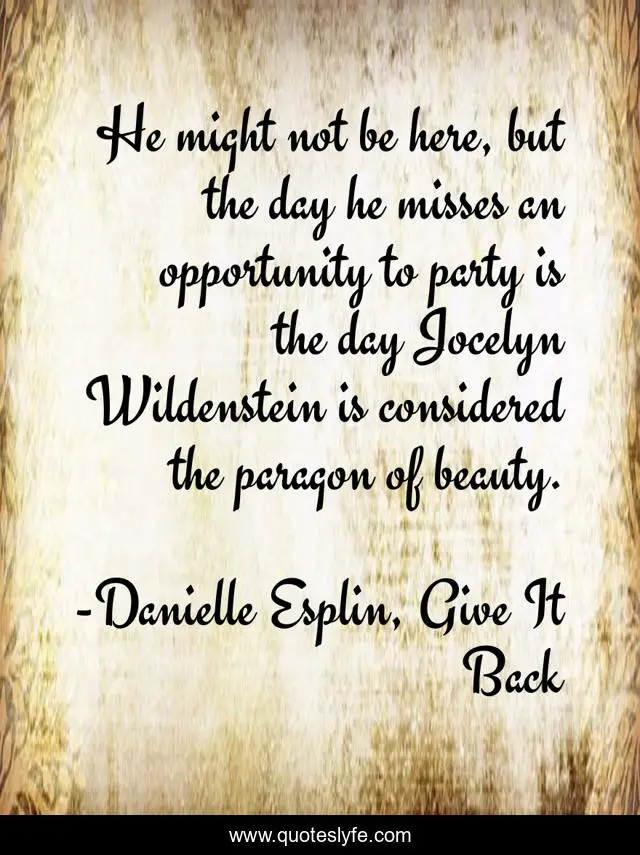 This page presents the quote "He might not be here, but the day he misses an opportunity to party is the day Jocelyn Wildenstein is considered the paragon of beauty.". Author of this quote is Danielle Esplin, Give It Back. This quote is about party, party-animal, unlikely, beauty, sarcasm,.