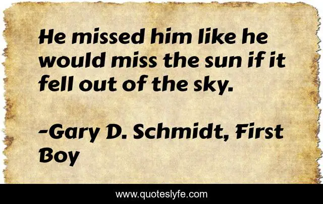 This page presents the quote "He missed him like he would miss the sun if it fell out of the sky.". Author of this quote is Gary D. Schmidt, First Boy. .