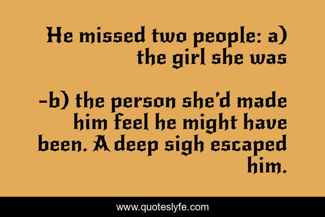 "b) the person she’d made him feel he might have been. A deep sigh escaped him. Quotes." Quoteslyfe.com, 2025. Mon. 08 Dec. 2025. <https://www.quoteslyfe.com/quote/He-missed-two-people-a-the-girl-203788>.