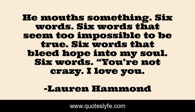 This page presents the quote "He mouths something. Six words. Six words that seem too impossible to be true. Six words that bleed hope into my soul. Six words. “You’re not crazy. I love you.". Author of this quote is Lauren Hammond. This quote is about asylum, insanity,.