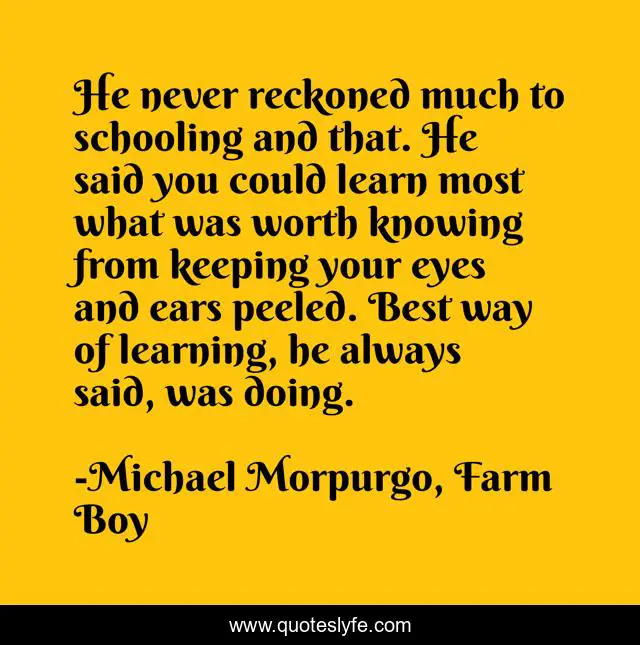 This page presents the quote "He never reckoned much to schooling and that. He said you could learn most what was worth knowing from keeping your eyes and ears peeled. Best way of learning, he always said, was doing.". Author of this quote is Michael Morpurgo, Farm Boy. This quote is about learning, school, education, observation, experience,.