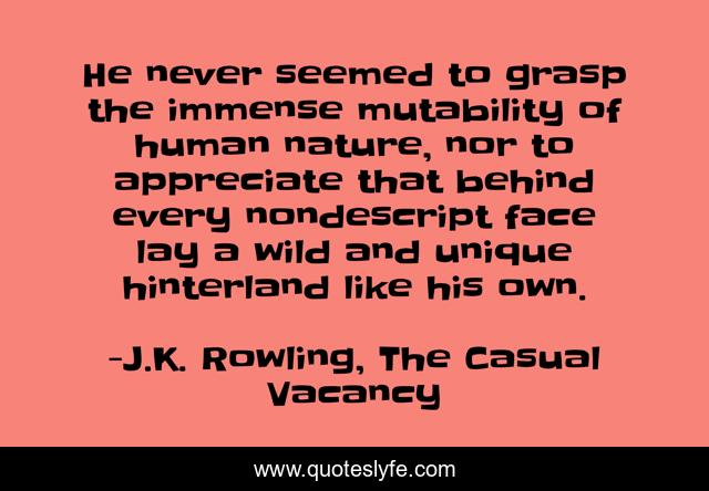 This page presents the quote "He never seemed to grasp the immense mutability of human nature, nor to appreciate that behind every nondescript face lay a wild and unique hinterland like his own.". Author of this quote is J.K. Rowling, The Casual Vacancy. This quote is about human-nature, uniqueness,.