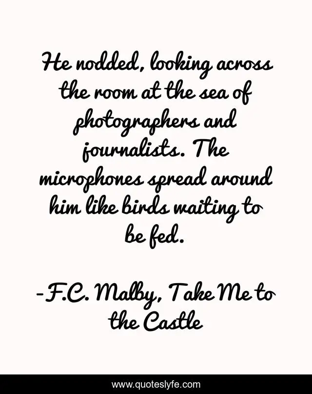 This page presents the quote "He nodded, looking across the room at the sea of photographers and journalists. The microphones spread around him like birds waiting to be fed.". Author of this quote is F.C. Malby, Take Me to the Castle. This quote is about literary-fiction, historical-fiction,.