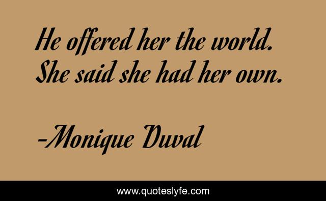 This page presents the quote "He offered her the world. She said she had her own.". Author of this quote is Monique Duval. This quote is about freedom, monique-duval, love, relationship, affection,.