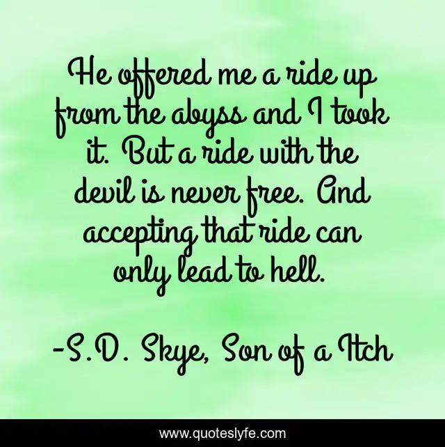 This page presents the quote "He offered me a ride up from the abyss and I took it. But a ride with the devil is never free. And accepting that ride can only lead to hell.". Author of this quote is S.D. Skye, Son of a Itch. This quote is about fbi, spy-thriller, russians, romantic-suspense,.