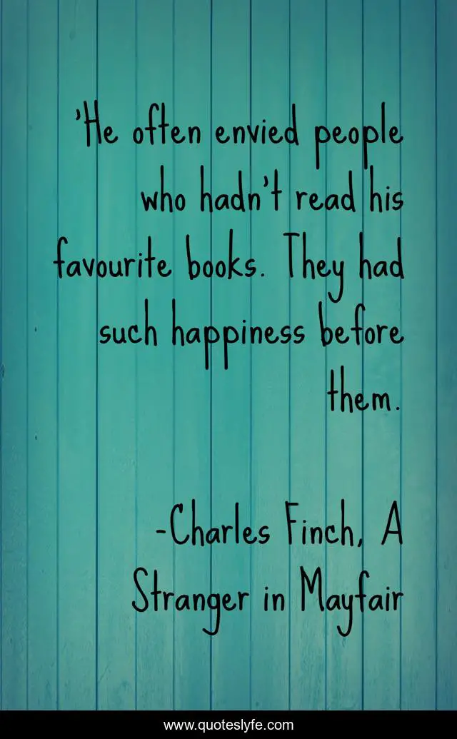 This page presents the quote "'He often envied people who hadn't read his favourite books. They had such happiness before them.". Author of this quote is Charles Finch, A Stranger in Mayfair. This quote is about books, books-reading,.