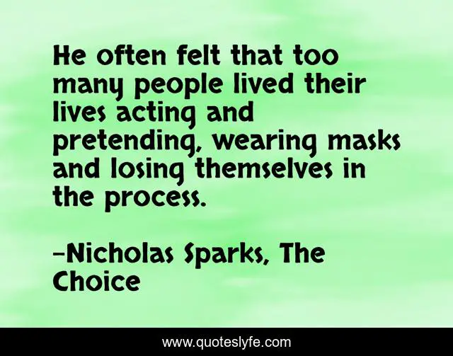 This page presents the quote "He often felt that too many people lived their lives acting and pretending, wearing masks and losing themselves in the process.". Author of this quote is Nicholas Sparks, The Choice. .