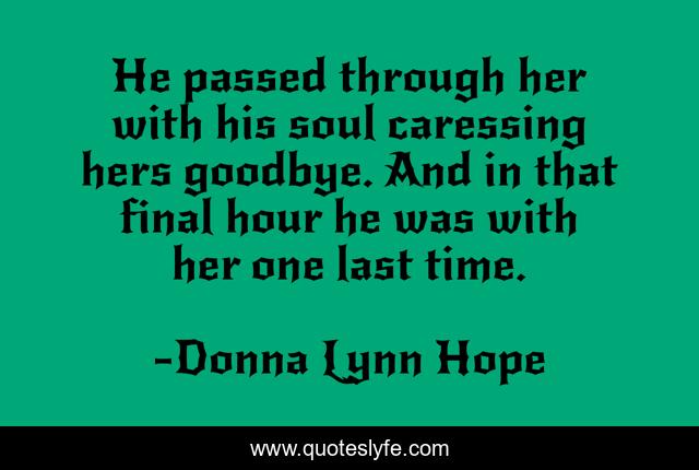 This page presents the quote "He passed through her with his soul caressing hers goodbye. And in that final hour he was with her one last time.". Author of this quote is Donna Lynn Hope. This quote is about loss, death,.