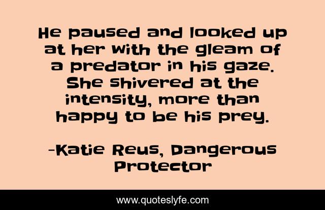 This page presents the quote "He paused and looked up at her with the gleam of a predator in his gaze. She shivered at the intensity, more than happy to be his prey.". Author of this quote is Katie Reus, Dangerous Protector. This quote is about romantic-thriller, romantic-suspense,.