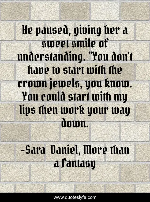 This page presents the quote "He paused, giving her a sweet smile of understanding. "You don't have to start with the crown jewels, you know. You could start with my lips then work your way down.". Author of this quote is Sara Daniel, More than a Fantasy. This quote is about romance, erotica, novella, short-story,.