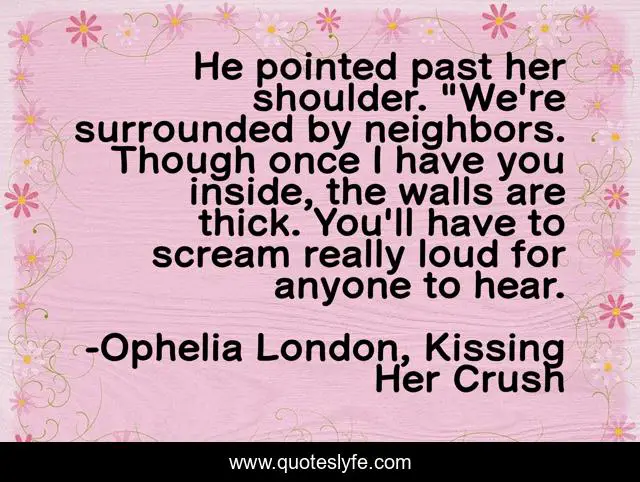 This page presents the quote "He pointed past her shoulder. "We're surrounded by neighbors. Though once I have you inside, the walls are thick. You'll have to scream really loud for anyone to hear.". Author of this quote is Ophelia London, Kissing Her Crush. .