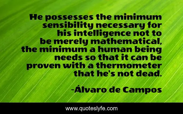This page presents the quote "He possesses the minimum sensibility necessary for his intelligence not to be merely mathematical, the minimum a human being needs so that it can be proven with a thermometer that he's not dead.". Author of this quote is Álvaro de Campos. This quote is about seeing, life, existence, nature, being, paganism, pantheism, ricardo-reis, thermometer,.