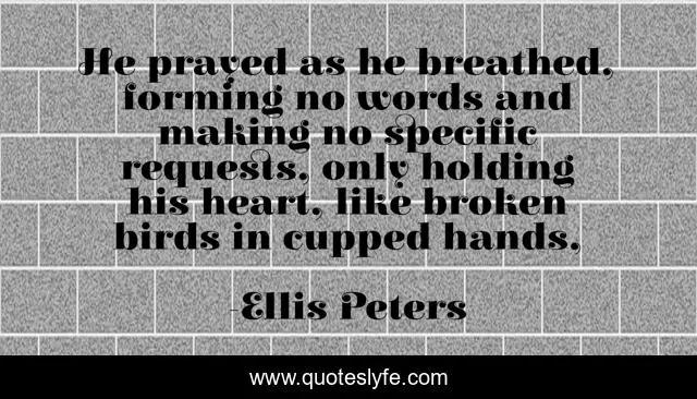 This page presents the quote "He prayed as he breathed, forming no words and making no specific requests, only holding his heart, like broken birds in cupped hands, ". Author of this quote is Ellis Peters. This quote is about grief, monastery, silence, prayer,.