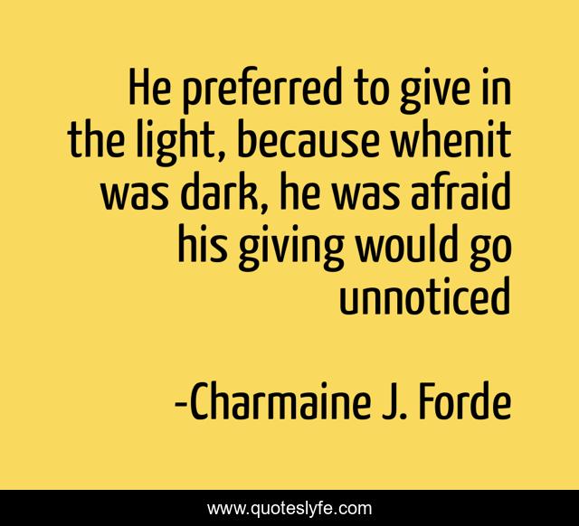 This page presents the quote "He preferred to give in the light, because whenit was dark, he was afraid his giving would go unnoticed". Author of this quote is Charmaine J. Forde. This quote is about afraid, unnoticed, give, light, preferred, dark,.