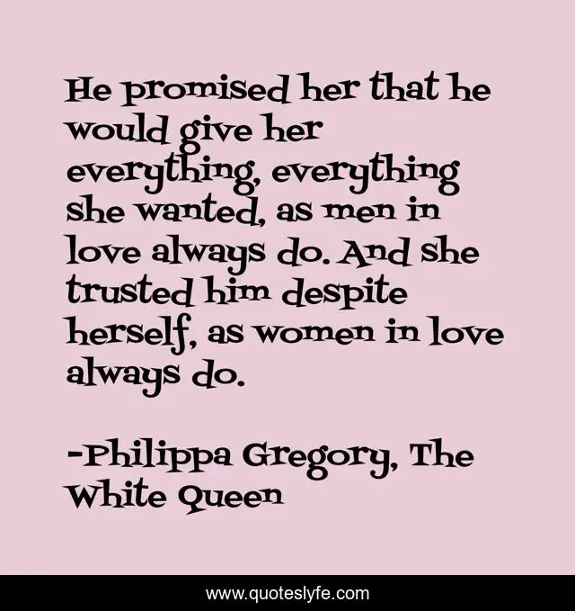 This page presents the quote "He promised her that he would give her everything, everything she wanted, as men in love always do. And she trusted him despite herself, as women in love always do.". Author of this quote is Philippa Gregory, The White Queen. This quote is about love, affection,.