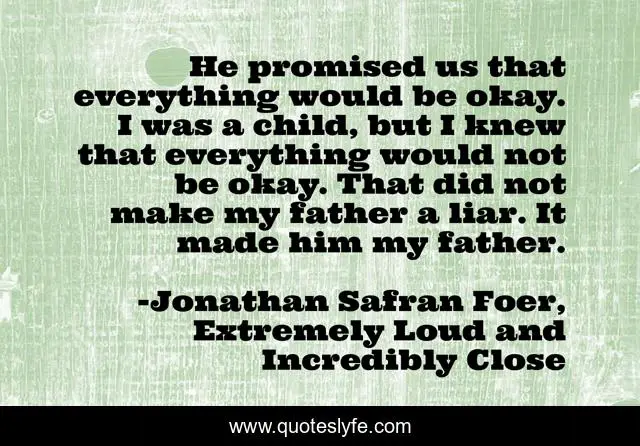This page presents the quote "He promised us that everything would be okay. I was a child, but I knew that everything would not be okay. That did not make my father a liar. It made him my father.". Author of this quote is Jonathan Safran Foer, Extremely Loud and Incredibly Close. This quote is about father, love, affection,.