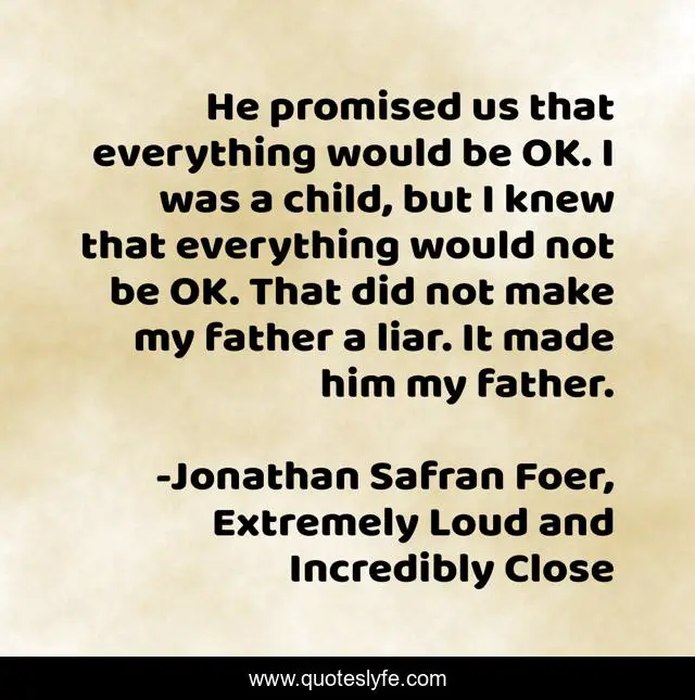 This page presents the quote "He promised us that everything would be OK. I was a child, but I knew that everything would not be OK. That did not make my father a liar. It made him my father.". Author of this quote is Jonathan Safran Foer, Extremely Loud and Incredibly Close. This quote is about promises, father,.