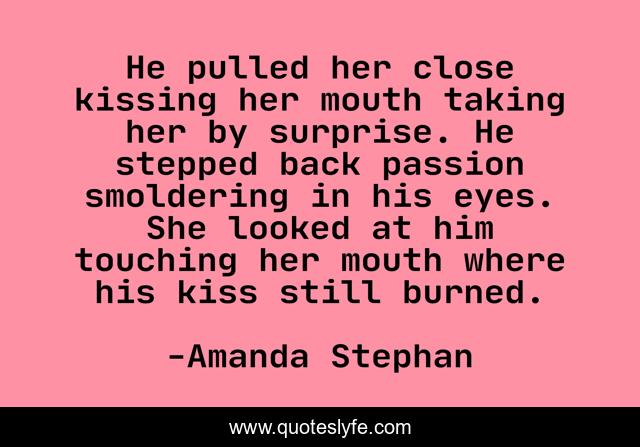 This page presents the quote "He pulled her close kissing her mouth taking her by surprise. He stepped back passion smoldering in his eyes. She looked at him touching her mouth where his kiss still burned.". Author of this quote is Amanda Stephan. This quote is about the-price-of-trust, love, romance, passion, kiss, surprise, affection,.