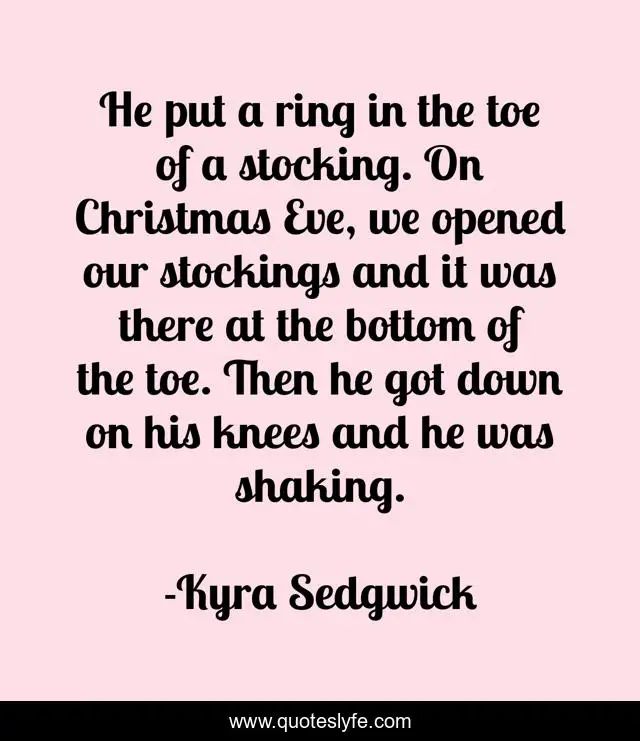 This page presents the quote "He put a ring in the toe of a stocking. On Christmas Eve, we opened our stockings and it was there at the bottom of the toe. Then he got down on his knees and he was shaking.". Author of this quote is Kyra Sedgwick. This quote is about down, ring, bottom,.