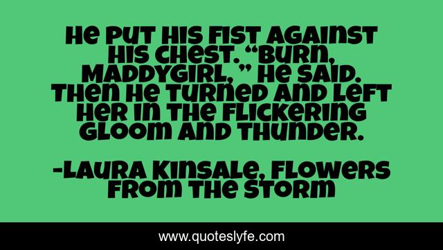 This page presents the quote "He put his fist against his chest. “Burn, Maddygirl, ” he said. Then he turned and left her in the flickering gloom and thunder.". Author of this quote is Laura Kinsale, Flowers from the Storm. This quote is about aphasia, stroke, passion, restrain,.