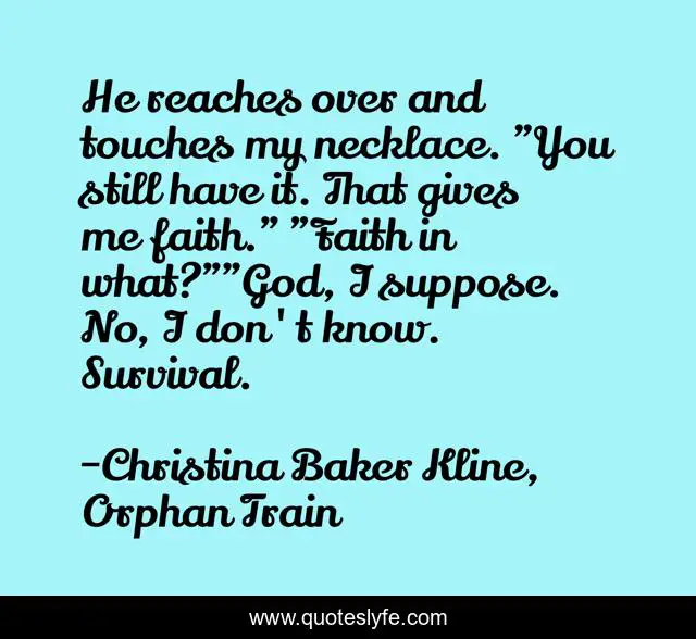 This page presents the quote "He reaches over and touches my necklace. "You still have it. That gives me faith." "Faith in what?""God, I suppose. No, I don't know. Survival.". Author of this quote is Christina Baker Kline, Orphan Train. This quote is about faith, survival,.