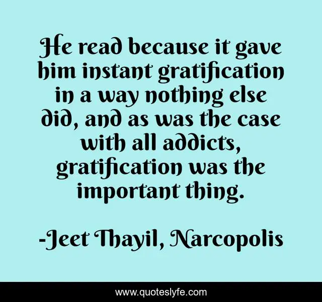 This page presents the quote "He read because it gave him instant gratification in a way nothing else did, and as was the case with all addicts, gratification was the important thing.". Author of this quote is Jeet Thayil, Narcopolis. This quote is about narcopolis, addiction, reading, gratification,.