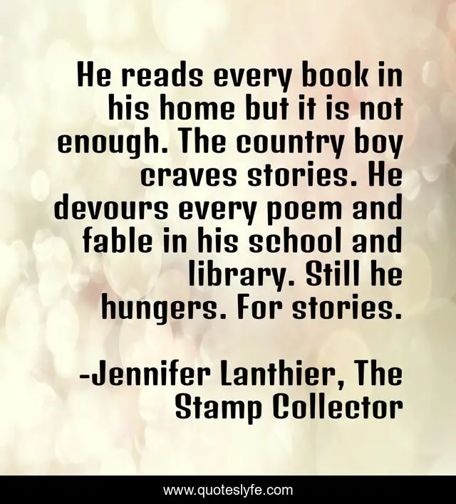 This page presents the quote "He reads every book in his home but it is not enough. The country boy craves stories. He devours every poem and fable in his school and library. Still he hungers. For stories.". Author of this quote is Jennifer Lanthier, The Stamp Collector. This quote is about freedom-of-speech, journalism, writing, stamps, china, prison,.