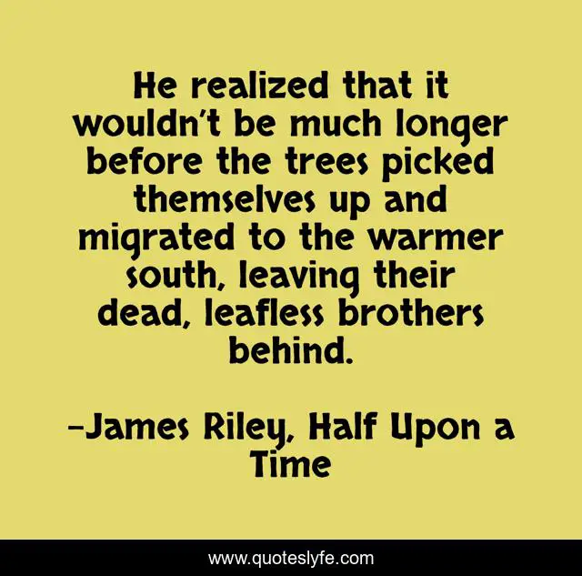 This page presents the quote "He realized that it wouldn’t be much longer before the trees picked themselves up and migrated to the warmer south, leaving their dead, leafless brothers behind.". Author of this quote is James Riley, Half Upon a Time. .