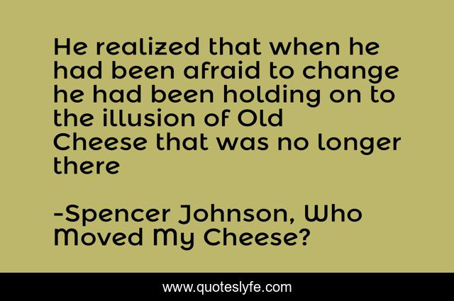 This page presents the quote "He realized that when he had been afraid to change he had been holding on to the illusion of Old Cheese that was no longer there". Author of this quote is Spencer Johnson, Who Moved My Cheese?. This quote is about metaphor, self-help,.