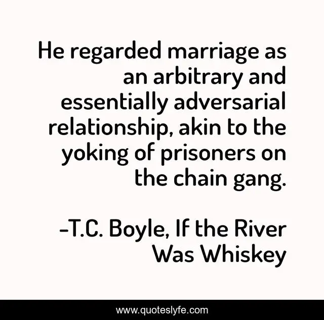 This page presents the quote "He regarded marriage as an arbitrary and essentially adversarial relationship, akin to the yoking of prisoners on the chain gang.". Author of this quote is T.C. Boyle, If the River Was Whiskey. This quote is about relationships, spouses, fighting, marriage, constraints, unhappiness,.