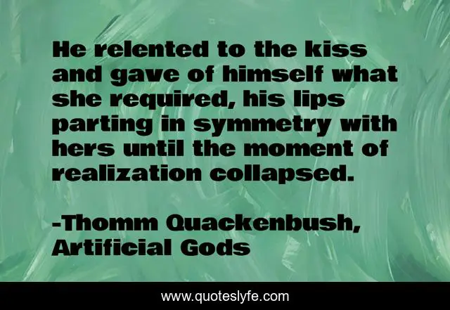 This page presents the quote "He relented to the kiss and gave of himself what she required, his lips parting in symmetry with hers until the moment of realization collapsed.". Author of this quote is Thomm Quackenbush, Artificial Gods. This quote is about kissing, kiss,.