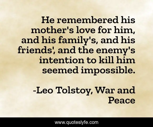 This page presents the quote "He remembered his mother's love for him, and his family's, and his friends', and the enemy's intention to kill him seemed impossible.". Author of this quote is Leo Tolstoy, War and Peace. .