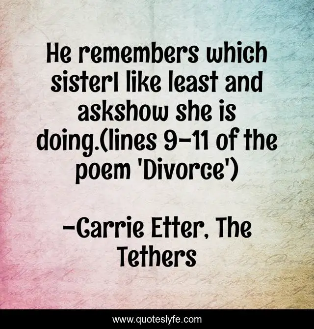 This page presents the quote "He remembers which sisterI like least and askshow she is doing.(lines 9-11 of the poem 'Divorce')". Author of this quote is Carrie Etter, The Tethers. This quote is about divorce, marriage, poetry, women,.