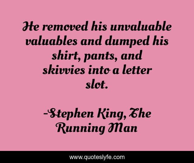 This page presents the quote "He removed his unvaluable valuables and dumped his shirt, pants, and skivvies into a letter slot.". Author of this quote is Stephen King, The Running Man. This quote is about stephen, king, running, contradiction, man,.