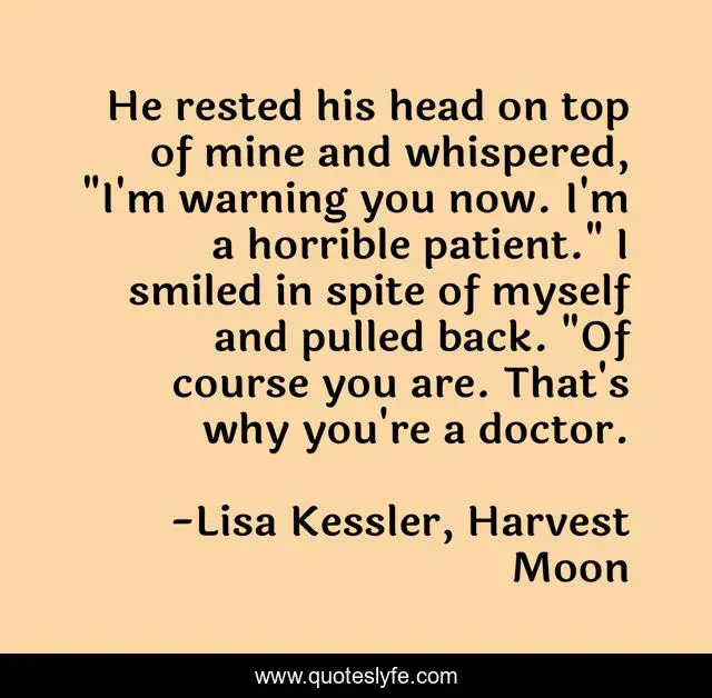 This page presents the quote "He rested his head on top of mine and whispered, "I'm warning you now. I'm a horrible patient." I smiled in spite of myself and pulled back. "Of course you are. That's why you're a doctor.". Author of this quote is Lisa Kessler, Harvest Moon. This quote is about doctor, shifters, boxing, hawaii, fighting, jaguars, nurse, wolves,.