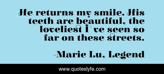 This page presents the quote "He returns my smile. His teeth are beautiful, the loveliest I've seen so far on these streets.". Author of this quote is Marie Lu, Legend. This quote is about june, day, teeth,.