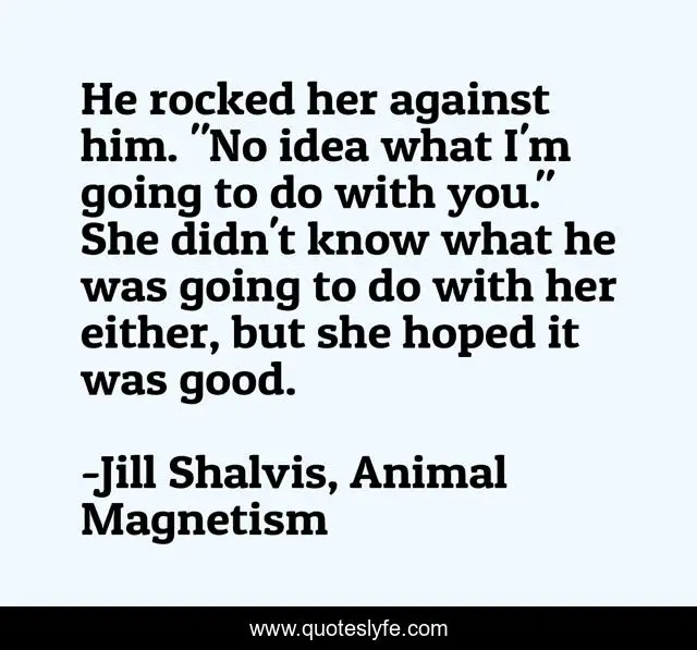 This page presents the quote "He rocked her against him. "No idea what I'm going to do with you." She didn't know what he was going to do with her either, but she hoped it was good.". Author of this quote is Jill Shalvis, Animal Magnetism. This quote is about animals, contemporary-small-town-romance,.