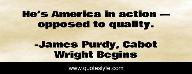 This page presents the quote "He’s America in action — opposed to quality.". Author of this quote is James Purdy, Cabot Wright Begins. .