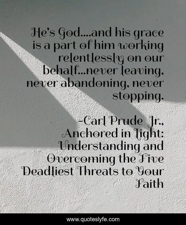 This page presents the quote "He's God....and his grace is a part of him working relentlessly on our behalf...never leaving, never abandoning, never stopping.". Author of this quote is Carl Prude Jr., Anchored in Light: Understanding and Overcoming the Five Deadliest Threats to Your Faith. This quote is about faithful, anchored-in-light, grace,.