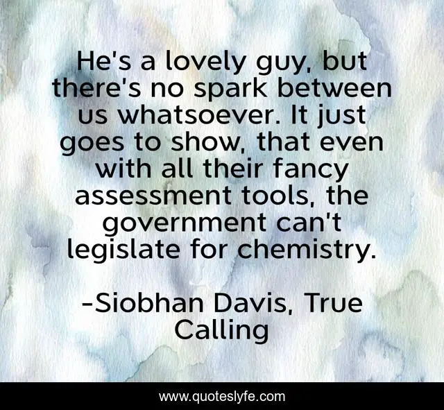 This page presents the quote "He’s a lovely guy, but there’s no spark between us whatsoever. It just goes to show, that even with all their fancy assessment tools, the government can’t legislate for chemistry.". Author of this quote is Siobhan Davis, True Calling. This quote is about dystopian, dystopian-romance, ya, romance-love-heartache, romance, fantasy-young-adult, sci-fi,.