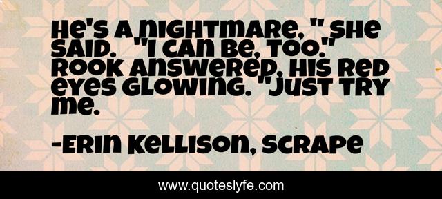 This page presents the quote "He's a nightmare, " she said. "I can be, too." Rook answered, his red eyes glowing. "Just try me.". Author of this quote is Erin Kellison, Scrape. This quote is about nightmares, dreamscape, oneiros, paranormal, sandman,.