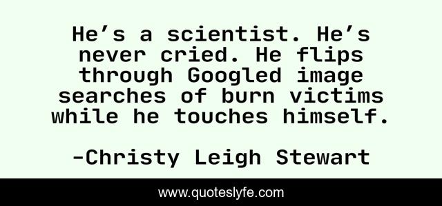 This page presents the quote "He’s a scientist. He’s never cried. He flips through Googled image searches of burn victims while he touches himself.". Author of this quote is Christy Leigh Stewart. .