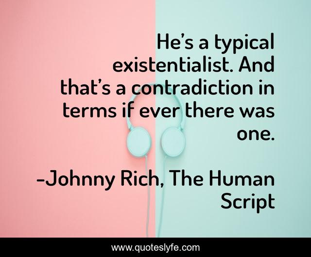 This page presents the quote "He’s a typical existentialist. And that’s a contradiction in terms if ever there was one.". Author of this quote is Johnny Rich, The Human Script. This quote is about existentialist, existentialism,.